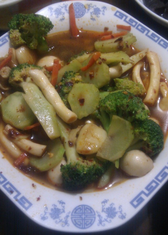 今天同場加映的是 綠花椰菜+白色菇+老干媽下去炒..不錯吃..因為老干媽剩下一點,乾脆加下去拌炒。可惜水分多了點..因為要清玻璃瓶裡面的老干媽殘渣..