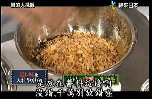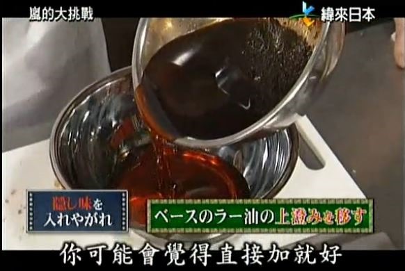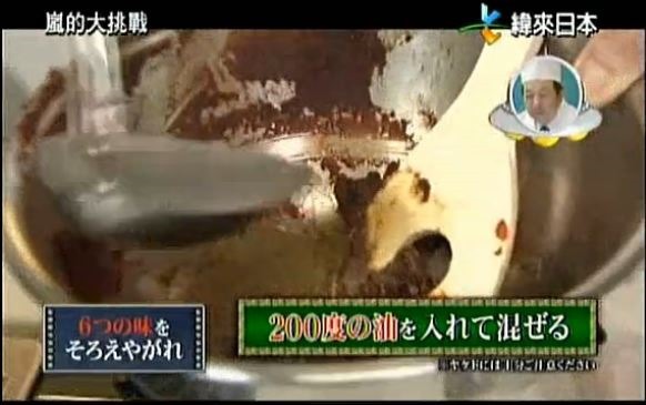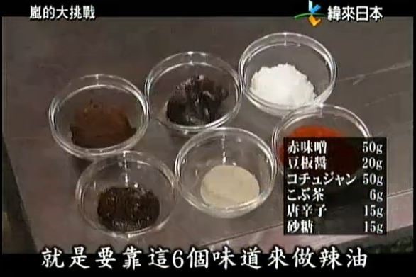 這是20120526-嵐的大挑戰(嵐にしやがれ)節目當中,陳建一教松本潤在家就可以輕鬆做的蔬菜辣油。我向來對這種辣油、萬能調味料等等真的是沒轍...既然找到了,怎麼可以錯過呢。趁休息空檔趕緊用手機看影片然後整理一下做法吧!