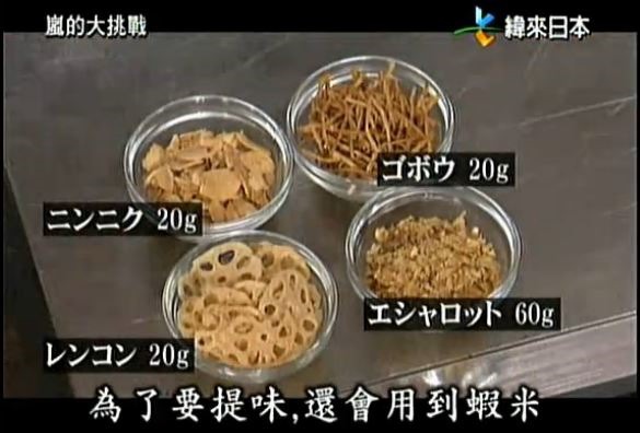 這五種提味的食材為,蓮藕20g、紅蔥頭60g、大蒜20g、牛蒡20g、蝦米(金鉤蝦)20g