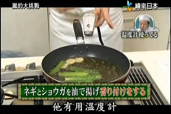 松本潤問說怎麼知道油溫到達200度了…陳師傅回答說…用看的就知道了…難怪松本潤自己做時會動用到溫度計….